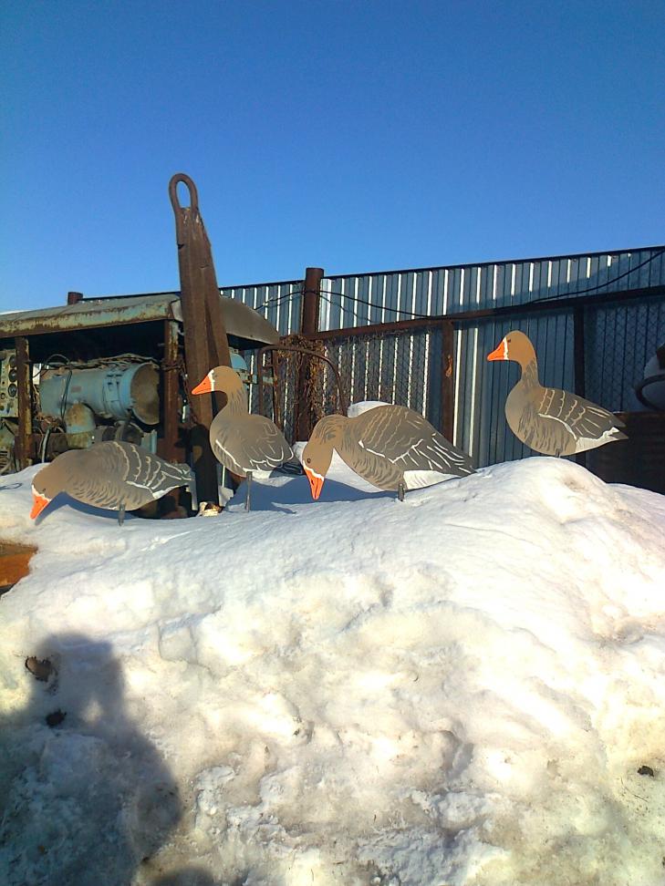 Я всю жизнь охочусь только с профилями,объёмных никогда не было.К профилям гуси никогда не подсаживались,только низко облетали их по кругу,иногда по два раза.На несколько уверенных выстрелов этого вполне хватает.А зачем нужно чтобы подсаживались,живьём их ловить что-ли? Профиля,что продаёт варяг,сделаны и раскрашены очень качественно,только думаю для этой компании вполне достаточно одного сторожевого гуся.