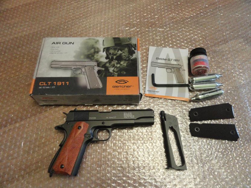 2.Gletcherclt 1911 Пистолет с самым мощным "блоу-беком". С деревянными накладками рукояти(родные пластик в комплекте) Состояние отличное. Комплект на фото. Цена 4000 (3000 пистолет+1000 накладки).