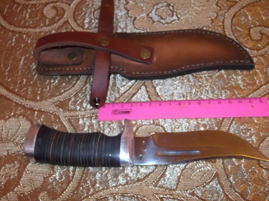 К продаже нож...ранее на форуме продавался (без ножен), к нему добавлены ножны ручной работы + заточен. Рукоять наборная кожа. Ножны сшиты вручную,специально под данный клинок (мастерская Романа Серкова). Сталь-не знаю, но точился с трудом. Мастер (клеймо на клинке), как пояснил предыдущий владелец он не помнит,но достаточно известен. Нож своеобразный, ближе к виду разделочных. Все размеры на фото. Толщина клинка от 3 до 4 мм от острия к рукояти...Причина продажи-приобретен нож (изготовлен) по заказу....