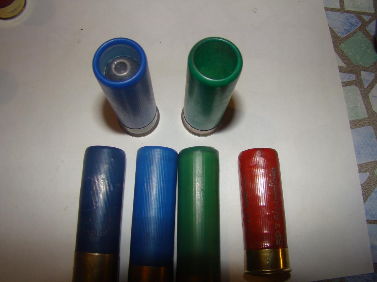 Фото 1: Синие - пулевая Вэлконт, зеленые GAep (красная RCC засыпана только дробью и поддавлена "колокольчиком" на станке Lee для придания конуса, фото конечно не информативное, но конус задает очень зачетный)