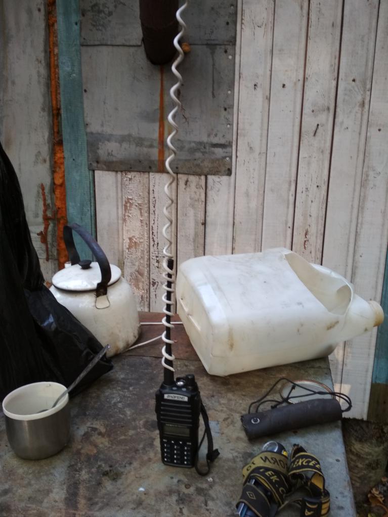 Вот еще из области самоделок. Рация на охоте нередко востребована. Но вот в свободное время она с успехом выполняет роль радиоприемника. Думаю, немало мест, где прием радио FM диапазона затруднителен. Вот такая примочка значительно улучшает качество приема. Штыревая антенна из найденного куска алюминиевого провода. Длину и ориентацию нужно подобрать опытным путем. Характерно, что сигнал улучшается, пока держишь корпус рации в руках. Понятно. Несимметричной антенне нужен противовес, имитирующий землю. Нашлось два решения. Поставил приемник на обитую металлом крышку ящика. Второй - вставил корпус в дыру прогнившего мокрого пенька. Был бы сухой - ничего бы не вышло.