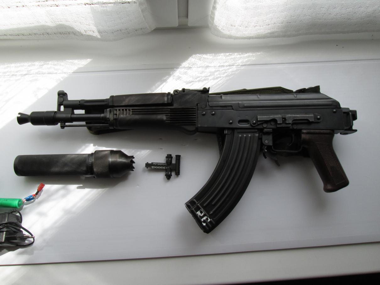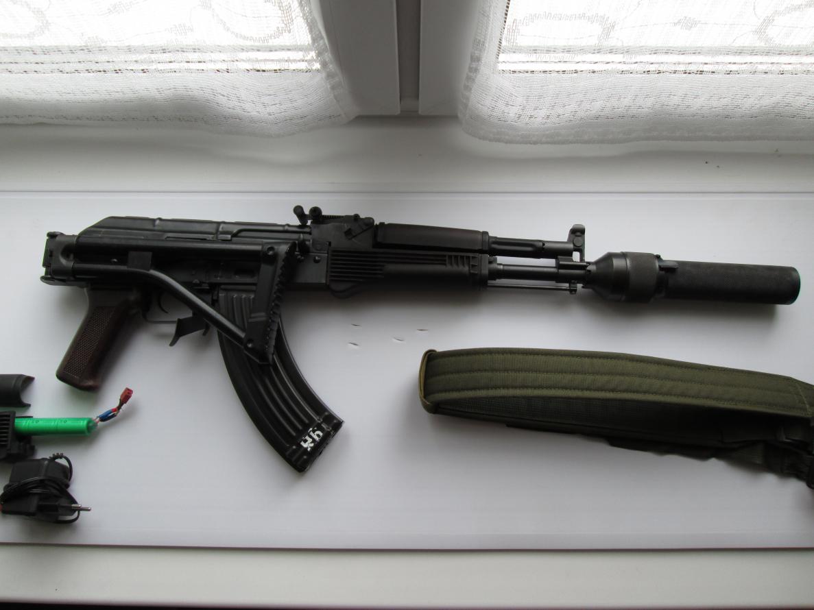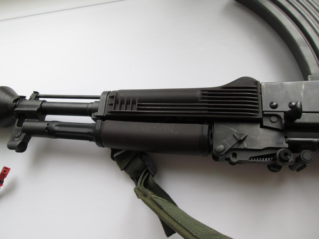 Установлена настоящая газоотводная трубка с накладкой слива, цевьё слива. Кольцо цевья с антабкой. В комплекте родные чёрные. Приклад такой стоял, не знаю от чего он. Откидывается в право, если ставить муляж оптики то очень удобно. В комплекте муляж ПБС-1 изготовлен из металла , планка для ПБС-1 настоящая. Колодка мушки, шомпол и ствол всё прикручено доп. винтами. Всё собрано без люфтов, ни где не чего не болтается.