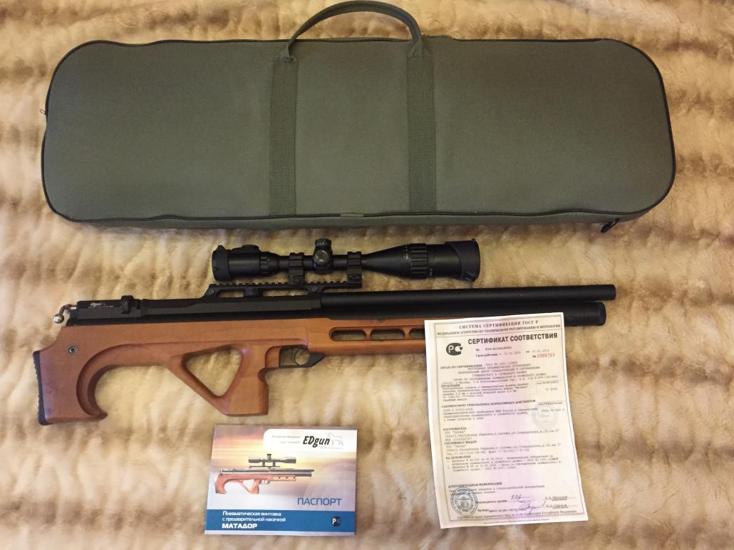 Продам пневматическую (PCP) винтовку EDgun Матадор 6,35 мм. длинная, с оптическим прицелом Leapers UTG 4-12x40. Настрел две коробки. Состояние новой. Комплект полный (2а барабана, сумка-чехол, паспорт, сертификат). Цена 60к. тел. 985-8II-I8-57