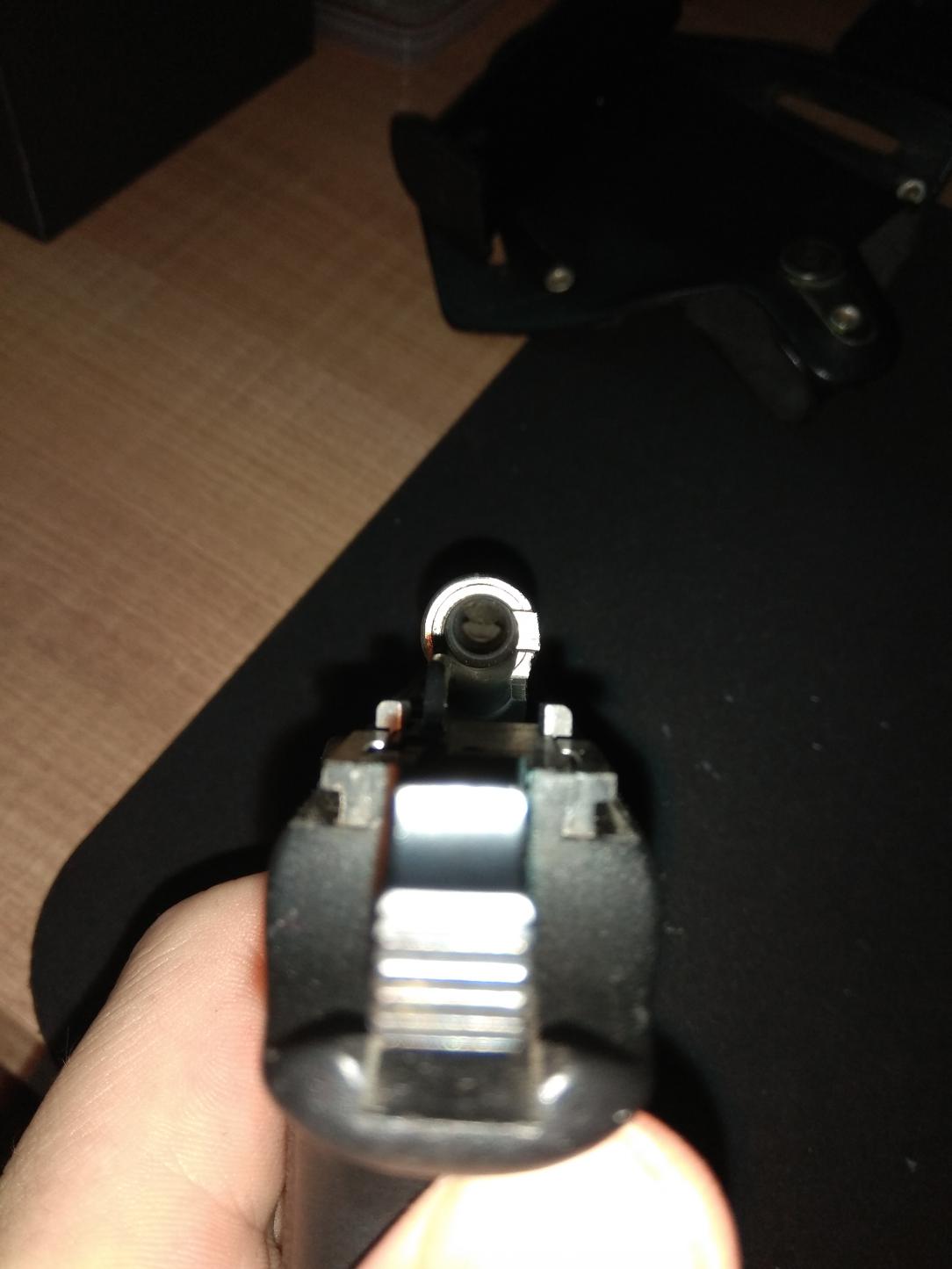 Просвет не особо видно. Проточка под патронником, видно её вот с такого ракурса (нужно убрать направляющую и пружину):