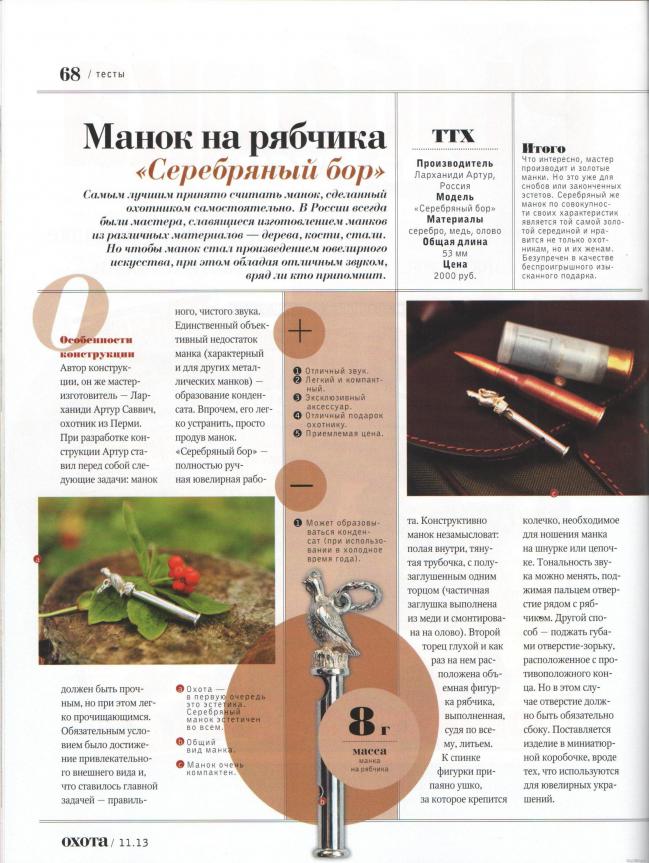 манок серии "Серебряный бор" (материал серебро, внутренняя вставка медь или алюминий, пайка на олово) манок абсолютно рабочий, каждый настраиваю индивидуально. в стоимость манка входит футляр. стоимость манка 2000 руб + 200 руб пересылка оплата возможна через карту сбербанка пересылка из Перми по всем вопросам пишите на почту a.larhanidi@mail.ru |