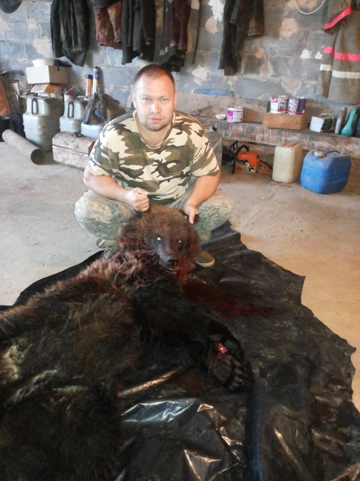 Приехав домой мы были расстроены увидев мишку – он был не такой за которым мы ехали. . Мы с Михаилом Николаевичем налили по маленькой и начали варчять как старые бабки )))) в ожидании стрелка промывая ему кости. В 2 ночи, когда Александр вернулся, рассказал как было дело. Они приехали на место и потихоньку пошли по полю к лабазу, не доходя до него метров 50, неожиданно из овсов, по ходу движения, поднялся медведь на задние лапы и тут уже не оставалось вариантов….пришлось стрелять….. Саша остался на поле желая реабилитироваться убив большого кабана , но все было не в его пользу. На поле вышли опять двое медвежат с мамкой которая постоянно рычала и не давала кабанам с другого берега Камы зайти на поле. Потом вышел туман , что очень усложнил наблюдение, только в ночи были слышны всплески в реке и хрюканье, как довольные кабаны переправлялись на поле через нее. В итоге не дождавшись звонка от Саши егеря сами приехали за ним и на этом охота закончилась…..