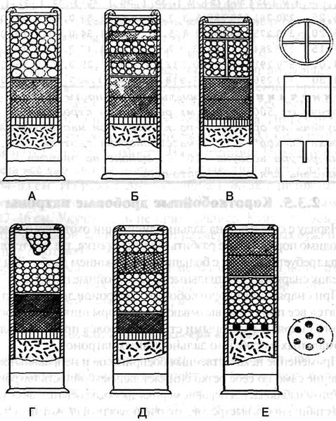 Рис. 57: Снаряжение короткобойных патронов: А - Патрон с разными номерами дроби; Б - Патрон с расслоенной дробью; В - Патрон с крестовиной; Г - Патрон с "Парашютом"; Д - Патрон с надрезанным по высоте войлочным пыжом; Е - Фауст-патрон; 2.3.5. Короткобойные дробовые патроны Наряду с стрельбой на дальние дистанции охотнику бывает необходимо поразить и не разбить дичь накоротке, т. е. это те случаи, когда требуется патрон с большим рассеиванием дроби. Для этого стрелок снаряжает специальные короткобойные патроны. При снаряжении короткобойных патронов до крайности доводятся все причины, вызывающие деформацию и разброс дробового снаряда, с которыми стрелок боролся при изготовлении нормальных и особенно дальнобойных патронов. Применение некачественных боеприпасов и неправильное снаряжение само по себе резко снижает дальнеубойность патрона, но при этом наблюдается неравномерная дробовая осыпь и не сохраняется стабильность выстрелов, что очень важно для охотника и дичи. Все короткобойные патроны снаряжаются с повышенным зарядом бездымного пороха на 0.1-0.3 г, а в фауст-патроне его добавляют до 0.4-0.5 г. Это необходимо для компенсации потери скорости движения дроби и повышения эффекта ее разброса в связи с применением всевозможных приспособлений и необычного снаряжения патронов. 2.3.5.1. Снаряжение патронов с различными номерами дроби Ведется подобно нормальному патрону с той лишь разницей, что на прокладочный пыж засыпают 1/4-1/5 часть общего веса дроби, которая на 2-3 номера крупнее, чем основной снаряд, расположенный выше (рис. 57А). Нижние дробины, имеющие большую массу, получив при выстреле одну и ту же начальную скорость, лучше сохраняют живую силу, чем мелкая дробь, ударяют в последнюю и разбрасывают ее. С увеличением количества и размера дроби нижнего слоя возрастает и разброс дробового снопа. 2.3.5.2. Разделение дробового снаряда по высоте прокладками Патрон с расслоенной дробью (рис. 57Б) делают так: дробовой снаряд, в зависимости от требуемой кучности, разделяют на 3-4-5 частей. Затем первую порцию засыпают на прокладочный картонный пыж, утрясают ее и перекрывают сверху картонной прокладкой толщиной 0.5-0.7 мм или войлочной - толщиной в 3 мм. На эту прокладку насыпают следующую часть дроби, а на нее опять кладут прокладку и т. д., пока весь снаряд не будет помещен в гильзу. На последнюю порцию дроби кладут дробовой пыж и края у бумажной гильзы завальцовывают. При вылете из канала ствола прокладки быстро тормозятся, дробь ударяется в них и рассеивается. 2.3.5.3. Патрон с крестовиной Берут картон толщиной в 1-1.5 мм и делают из него крестовину длиной 4/5 высоты дробового столбика и шириной, равной поперечнику гильзы (рис. 57В). Крестовину вставляют на картонную прокладку и в ее отсеки засыпают 4/5 части дробового снаряда. На дробь с крестовиной кладут дробовой картонный пыж и на него досыпают оставшуюся 1/5 часть снаряда, закрывают ее вторым дробовым пыжом и закрепляют последний. Крестовина делит дробовой снаряд на четыре части, и на мишени получается четыре обособленных дробовых осыпи, а середина остается обычно пустой. Чтобы заполнить и середину дробью, оставшуюся пятую часть снаряда помещают впереди. Этот патрон на дистанции до 20 м дает диаметр дробовой осыпи около 80-90 см. 2.3.5.4. Патроны с «парашютом» Дают очень хорошее рассеивание. На картонный прокладочный пыж н
