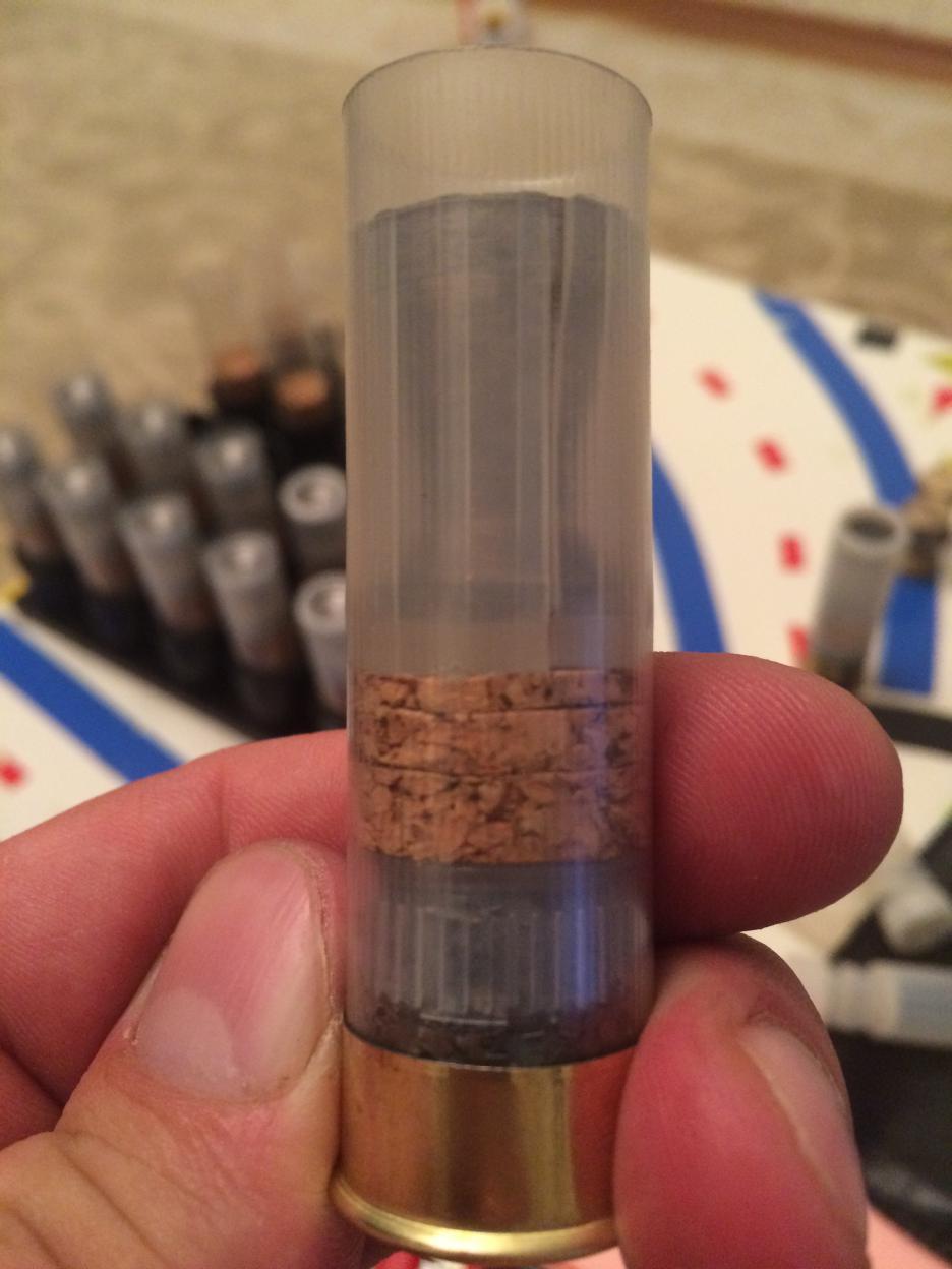 Но, лично мне своими характеристиками, больше понравился дисперсант собранный с "крестовиной". Но не с одним разделителем дробового снаряда на четыре части, а с частью дроби, через дробовую прокладку, засыпанной перед креставиной. Поясню, когда дробовой снаряд разделен только на четыре части, при выстреле дробовая осыпь имеет выраженную крестообразное расположение полей, с пустотой по центру. А вот для поражения центрального поля осыпи, как раз и служит часть дроби через прокладку, засыпанная перед креставиной. Цитата: