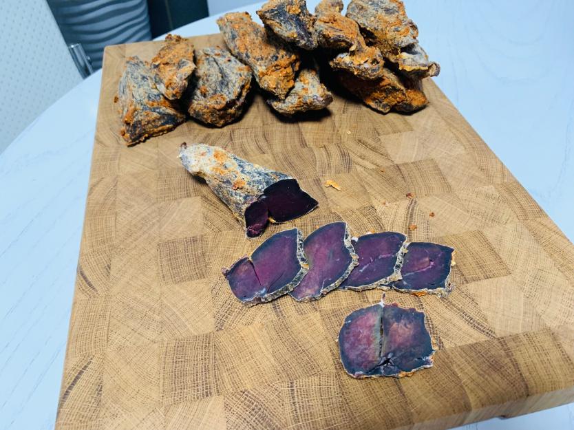--------ВИДЕО РЕЦЕПТ. Добытый козлик оказался упитанным и даже жирным. Заднюю ногу на бастурму. Захотелось не обычного маринада. Основной приправой для бастурмы считается – Чаман, я его тоже использую, но в этот раз поступил так: мясо кусочками-брусками 3-4 см на 5-7 см укладываем на подушку из соли и засыпаем полностью каменной – крупной солью. Мясо даст сок, который лучше бы сливать и досыпать сухую соль. Солилась таким образом трое суток. После промываем холодной водой и отмачиваем 3 часа в холодной воде, периодически ее меняя (я пять раз менял). Обсушиваем с помощью бумажных полотенец. Занимаемся маринадом специй для обмазки бастурмы! Внимание специи: чаман (пожитник), копченая паприка, кориандр, водички туда, перемешиваем и пусть тоже настоится минут 20. А далее все элементарно просто, обмазываем мясо и развешиваем его на сушилку для белья… Трое суток – все готово, кто по суше любит – четыре нужно подержать. Вкус остренький, соленый, мясо нежное – с пивом или красным сухим вином просто восхитительная закуска. Дети вообще просто так кушают, как чипсы. Цвет – правильно полученную бастурму характеризует ее цвет при срезе – красно-рубиновый. Приятного аппетита, друзья! |