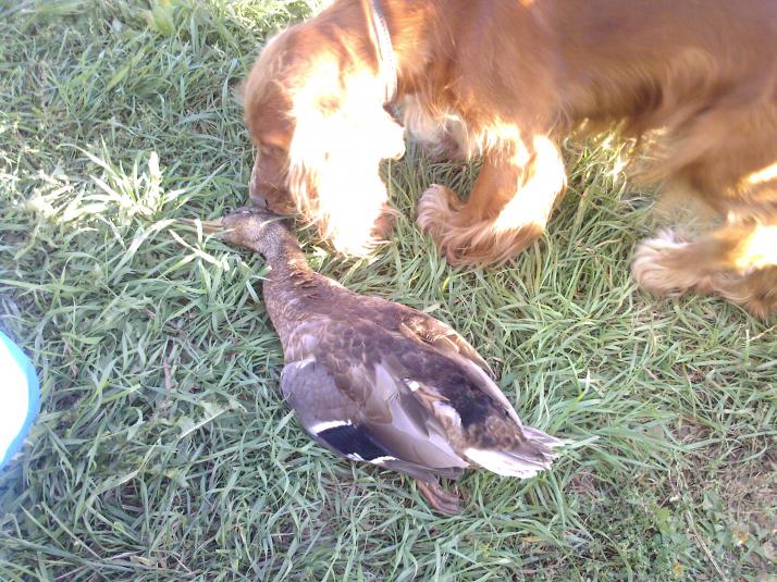 Собакин даже лапы не замочил, утка как-то сама со страху наверное, на берег вылезла. Глаз порадовал, 70 метров, сумел попасть.