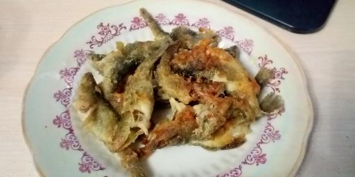 Рецепт до банального прост, но требует ловкости пальцев. Рыбок моем и потрошим. Нужно аккуратно вскрыть каждую и удалить внутренности. Икру складываем отдельно. Потом обваливаем в муке с солью и отправляем на разогретую сковороду. Обжариваем с одной стороны, затем с другой. Снимаем очень аккуратно - рыбки становятся хрупкими. Вкуснейшее нежнейшее белое мясо! Косточки и пёрышки превращаются в хрустящие чипсы. Голову тоже можно есть. Если делать с корочкой, то есть можно целиком. Рекомендую всем!