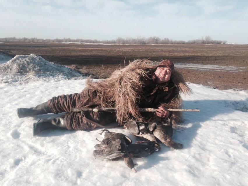 да около снежницы стреляли ноль и два ноля поле озимых но плохо взошедших выставляли 46 скорлупок краснодарских и 12 живое перо на краю поля около снежницы бурьян вот там в леших замечательно маскироватся летал утром и вечером но с утра минус 6 и лужа замерзало гусь снижался плохо а вечером когда оттает нормально ниже спускался, да ветер там сильный был гусь заходил в полветра, манили манками folks