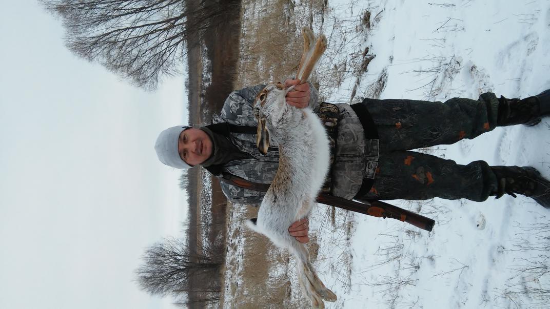 Пробежал метров500 и лег где я и понял по крови в кустах что он ранен. Гонял нас три с половиной часа. Несколько раз уже думали бросить эту затею. Ушёл в овраг а там блин лошади табуном ходили и след пропал. Поднялся метрах в ста от меня пока я кружил в поисках следов и понеслось всё заново. Ушел в поле и сделав круг вернулся обратно к оврагу и опять потерялся в лошадях. Обойдя округу метров двести нашли у зарослей лёжку с обилием крови. Но он походу нас просек раньше и ушел полем в другие посадки. Дойдя до них он вышел на накатанную дорогу и спасибо его длинным когтям нашли направление. Но он как будто издеваясь над нами сделал скидку и опять в лошадиные следы. Рядом камыш сухого озера и вот найди в них следы(( Начал лазить по камышу и о чудо капельки крови на камыше. Скакал по верхушкам не оставляя следов. Друг нашел кровяной след на кромке озера и камыша и пройдя метиов 15 слышим хруст и видим что он как кенгуру скачет через метровый камыш где и закончил свой неугомонный бег благодаря самокрученной двойке. Такого умного и живучего зая не разу еще не брали. Эмоции переполняли нас с другом. Отдышавшись рядом с трофеем отправились к машине прямым маршрутом и через пол часа пили чай. Начинаем потихоньку набираться опыта по распутыванию следов которые он накрутил убегая ой как сильно. Желаю всем трофеев и желательно трудовых чтобы не пропал азарт к охоте!!!!