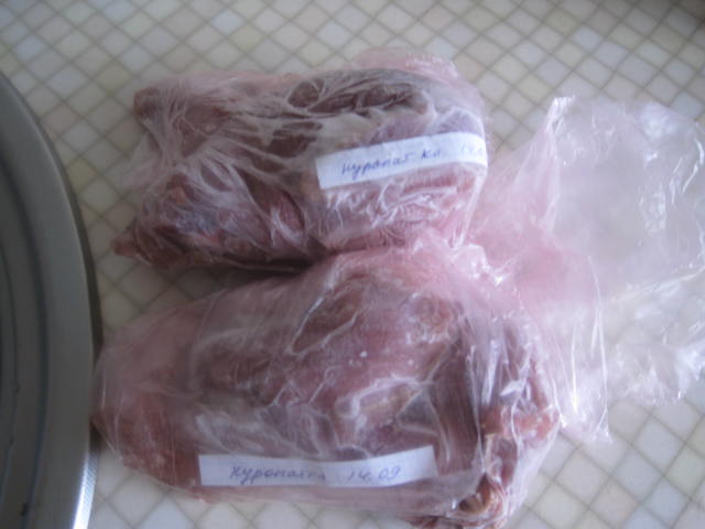 У жены предновогодний завал на работе,детей кормить надо,сосиски с макаронами всем надоели,поэтому очень простой рецепт ужина от samara.На первое суп из куропаток.Достал из морозилки парочку.Бульон варю всегда в двух кастрюлях из любой дичи.В одну закидываю куропаток,довожу до кипения и через 3-4 мин перекладываю в рядом закипающую другую кастрюлю(уходят все ненужные запахи и бульон всегда прозрачный).Туда мелкой лапши,пару картофелин,небольшую морковку и лук целиком.Готово.На второе кабанятина в духовке.В моем случае сверху в морозилке лежали ребра.Через чесночницу выдавил и обмазал кусочки чесноком(на 1 кг мяса 3 перышка),слегка поперчил набором "4 перца".посолил, в стеклянную емкость,которую сверху накрыл фольгой.Духовка электрическая 175С и 1 час приготовления,потом снял фольгу,включил верхний гриль и 10 мин для корочки. Готово.А для затравочки - холодец из косули.Рецепт простой,добываешь косулю,лучше две,не все ноги достанутся при разделке,берёшь ноги,кусок шеи и отвозишь к маме.Потом забираешь готовый холодец.Семья накормлена.