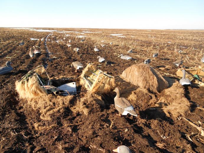 на кукурузе. самоделки,когда солнце всходит гусь от всего шарахается. удобно когда в ямах под них нет воды! По весу напишет человек который в них был может быть)) |