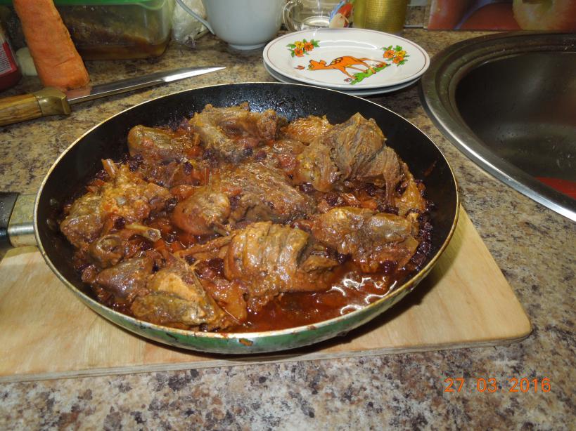 тоже сегодня полез в морозилку в надежде, что там еще что то осталось и обнаружил осеннего крякашика)) еще из первых без шкуры. с поздних не снимаю, а этот еще видимо августовский, местный. немного отмочил в воде, заправил майонезом. пока минут 20 в маринаде стоял, лук с морковкой обжарил на масле. ну и собственно вот что получилось.