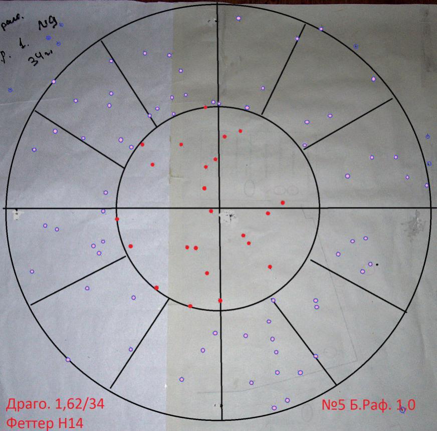 на 36-м 1,84гр, в 76-й гильзе (Азот). Обтюратор от биора Н18(Феттер, Гуаланди), Диана Н-8 + пробка Н-6, контейнер, резанный по размеру, от ГП Н-10, дробь ?0,?2 36гр + 0,7гр молотой пробки, закрытие звезда, с подкруткой.