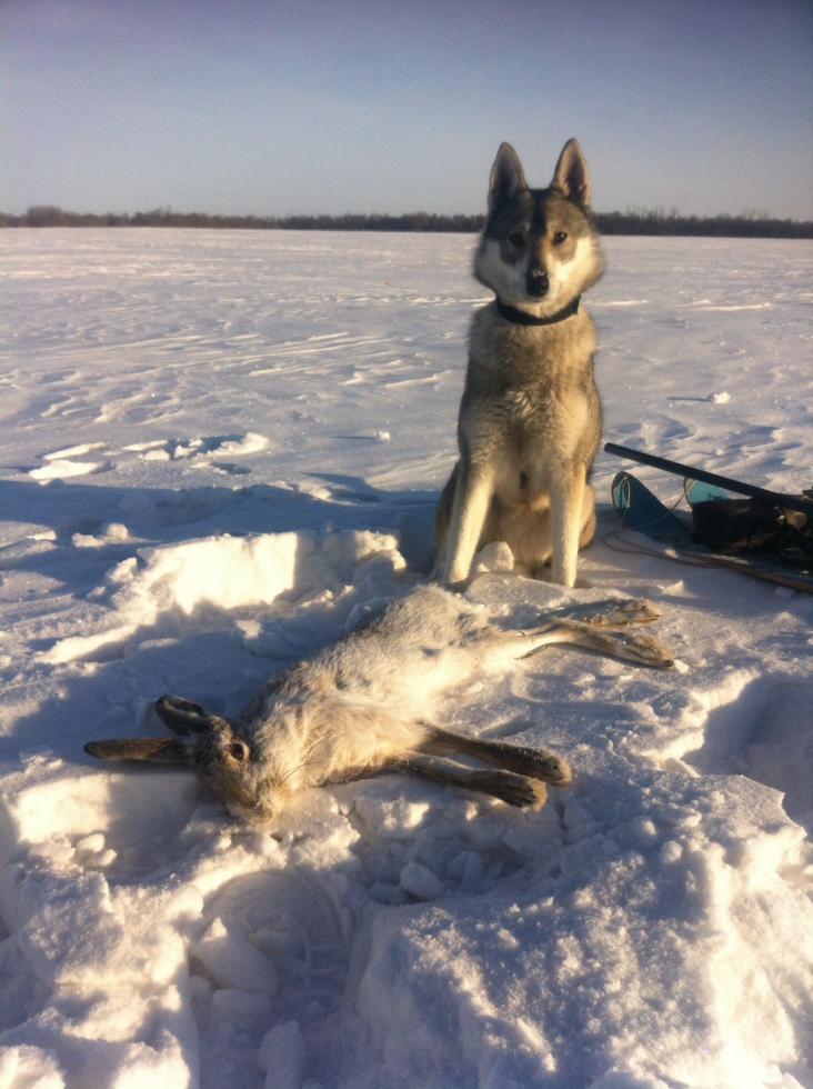 Вчера встал затемно, -22, и к удивлению сильного ветра не было, хотя по прогнозу обещали 9-11 м/с. в угодьях был уже на рассвете. За пол часа нашёл жировку, дал круг 1 км по выходному следу, который меня привел к исходной точке. Взял второй выходной след, ещё 1км, и я на других жирах. Делаю кольцо, выходного нету, пускаю в круг собаку, и иду за ней. Подьем на 30м, бью тройкой два раза, зая потяжелел, но сдаваться не хочет. Стрелять больше не стал т.к собака догоняла. При ошкуривании нашёл 6 дробин, проникновение слабое. Делаю вывод: - гусинный патрон на такие температуры, слабоват (2,3 сокола), хотя при -10 работали отлично. Надо зарядить отдельную партию, с навеской сокола на 1-2 десятки больше нормы.