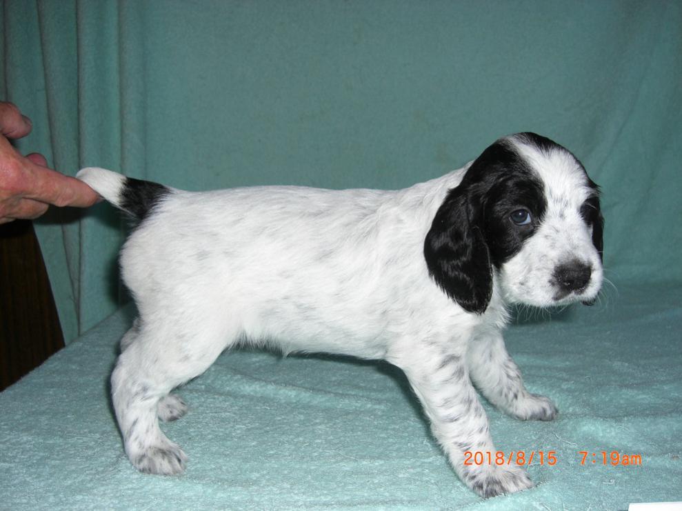 8 щенков: 5 кобелей (4 черно пегих, 1 рыже пегий) / 3 суки (2 черно-пегие, 1 рыже пегая).