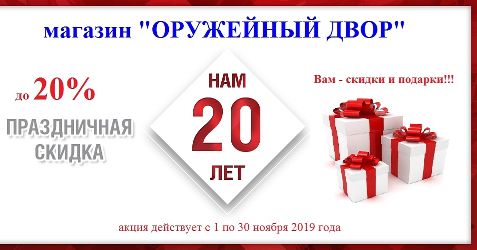 Уважаемые друзья, нашей компании "Оружейный двор" - 20 лет. Весь ноябрь - скидки до 20% и подарки!!! Приглашаем Всех в наш обновленный магазин.*