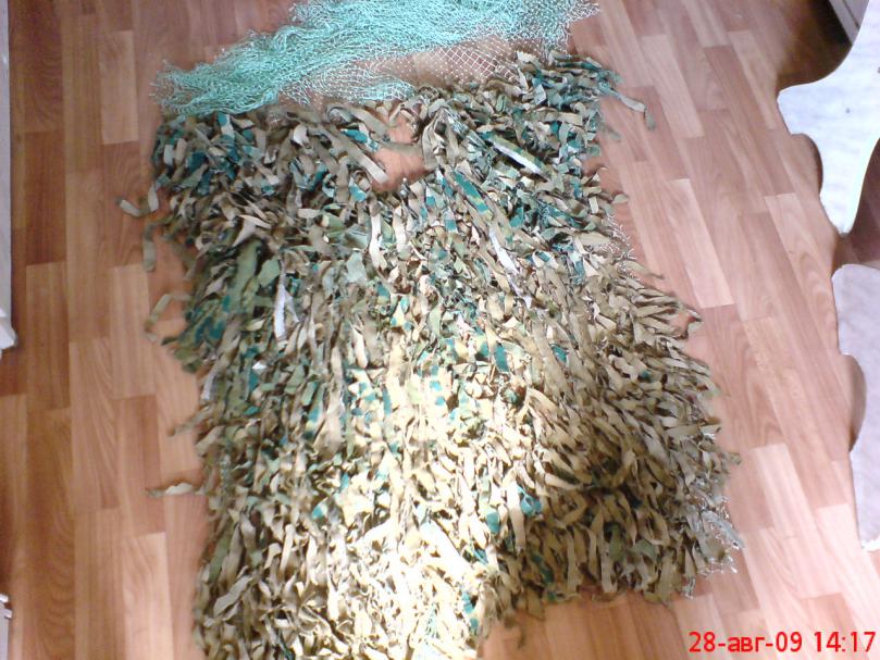 1.сетка ячея 1.5\1.5см полотно 2м на 4м 2 старые афганки\комки(с армии остались) 3 желанье афганку нарезал соломкой примерно ширина 3-5см и длина произвольно. в произвольном порядке на два узла привязывал. мне нравится. тока тяжеловатая. натуральный материал |
