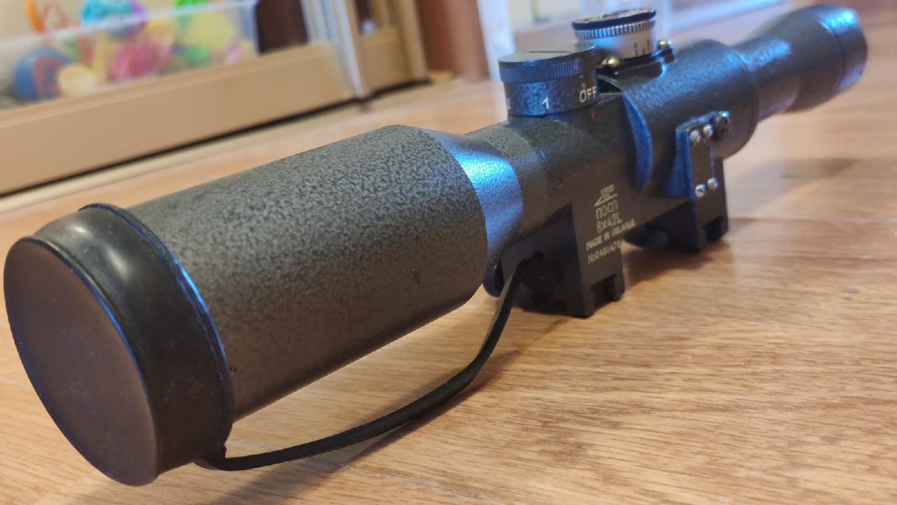 ПОСП 8х42WD. сетка парабола + подсветка. простой и неубиваемый, как топор однотрубник. крепеж на верх коробки что в отличие от большинства расширяет сферу его применения за пределы АК, СКС и СВД образных. откидные крышки в подарок. брал под кастом крон на СВТ, но руки так и не дошли. в итоге простоял на мелкашке пока не сменил на 16кратный лот 2. в редкой кратности 8х прекрасный выбор под охотничий болт, пневму или суровую страйкбольную инвестицию. цена 11000р.