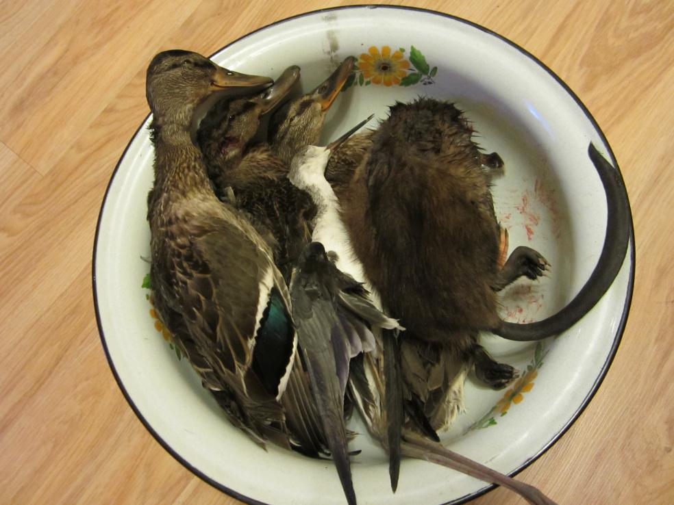Лет очень слабый, но все что подлетело удалось приземлить, а что не летало вытаптывалось ногами: лысуха, чирок (аж лопается от жира), 2 свиязя, крыжень и серая утка. Вот такая разношерстная добыча. |