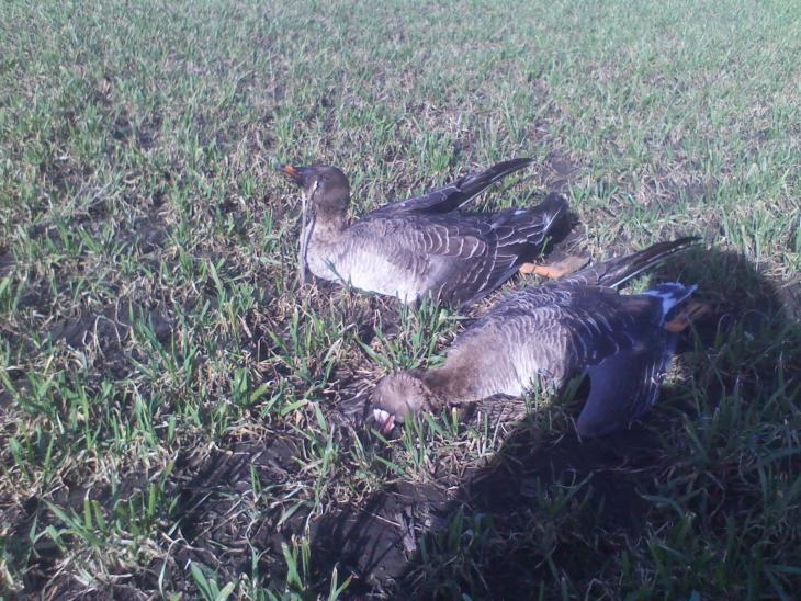 Ну что! Гусь по-пЁр.... сегодня был шанс... семь налётов. самый первый прям-прям... думал щя всё! ПАРУ СРАЗУ ВЫБЬЮ! шли чётко на мои профиля, на бреющем.. от земли метров 15-20. не долетая метров 80 до меня, резко вверх и в сторону... я долго думал чего их так испугало... потом спустя час вылез из лежака слить отработку... и увидел упавшее чучело гуся на спину, у кого полукорпуса тот поймёт, что это лежащие белое пятно на поле. Вот они его и испугались. Я этого не заметил, так-как -это было за головой... вот моя невнимательность меня и подвела.