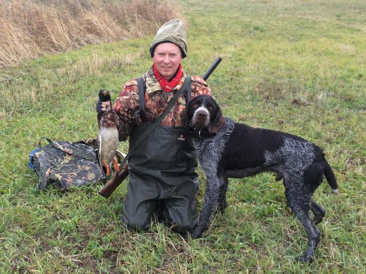В субботу охотился с отцом в Татарии на Вятке. Взял двух кряковых селезней. Одного днем с подхода, второго на вечорке. Красный шарф не помешал