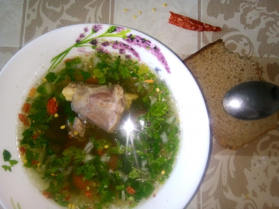 Пока тут Вы решаете брать или не брать, взял да и взял! Кусочек задней ножки, помыл в каструльку, воды и на газ. Добавил луковицу целиком, морковь пошинковал колечком, поварил на малом огне, снял пенку, ну их энти белки свёрнутые. Луковку прочь, добавляем пару картошин, солим, провариваем, незадолго до финиша помидор. Пока доходит кострулька готовим заправку: лук шинкуем мелко, чеснок мелко, кинзу и петрушку нарубаем. В одну ёмкость чутка соли и перца черного, закрываем крышку и сильно трясем какое то время, чтоб дало сок. Наливаем тарелку шурпишки, кусочек мяса, сверху щедро заправкой и острого перца по желанию. Приятного аппетита!
