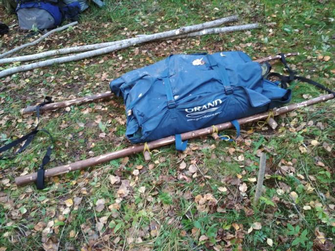 На утро было решено выбираться на ближайшую дорогу. По GPS определили направление выхода. Напрямую 1,2 км. Кто-то может съязвить: во мол забурились в дикую тайгу за 1 км от дороги)). Да, да, так и есть. Мы эти 1,2 км прошли за 1,5 !!! дня в упор. Первый рейс 100м с маленькими рюкзачками и с ружьями. Ну ессно пилка маленькая и мачете. Прорубаем коридор, подрубаем ветки на упавших деревьях. За 100м в лесу можно потеряться. Всего 4 ходки. Нужно же еще по меткам вернуться за второй ходкой. Туда-обратно 1,2 км выходит 9,6км. Потом гермомешок, далее упаковка с лодкой. Потом следующие 100 м и 4 ходки. Мы же не обезьяны – срубили елочки, к ним подвязали груз. Палку на плечо, груз между носильщиками. Уже удобнее. Но больно и груз раскачивается (фото справа). Упали под разлапистой елью, натянули тент уже в форме палатки по методу Григория Соколова. Вокруг трава мокрая, а под елью сухо. На второй день эвакуации рано утром нас разбудили рябчики. Охотиться не хотелось. Хотелось пить. Воды уже нет. Пришлось цедить из лужи, чтобы живность всякая в котелок не попала. Желтая вода после кипячения так и осталась желтой. Привкус земли. Но зато она мокрая. Научился есть живых муравьев. Жажду немного сбивает. Главное укусить первым, пока он тебя не укусил за язык. Утро посвятили подражанию голосам рябчика. Получается. Прилетают и садятся чуть не на голову. Но не стреляли. Их же потом еще и тащить надо будет. Сделали волокушу. Походили с ней – не понравилось. Переделали ее на носилки. Вот это результат! К носилкам подвязали ленту. Часть нагрузки на шее и плечах, часть на руках (фото посередине). Груз удалось перераспределить на 3 ходки. Так что кто попадет в подобную ситуацию рекомендую. Испытано на собственном горбу)). Когда появилась сеть и мы выбрались к дороге, вызвали уазик. Нас забрали в деревню. Так закончился наш сплав.
