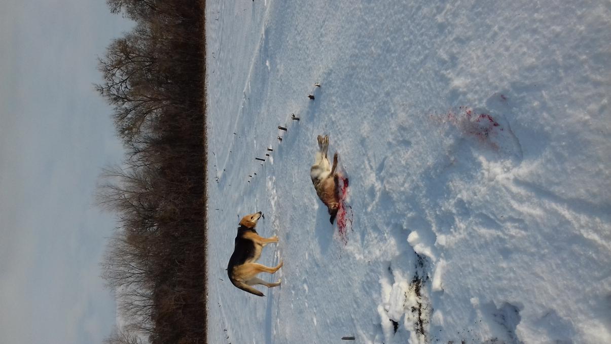 Но результат есть. Расписывать долго не буду. Первый лежал в посадке. Я стоял на номере в прогале, а он лежал за спиной метрах в 20-30. Уж когда пошли к машине, поднялся и на другую сторону выскочил на брата. Второго поднял выжлец в подсолнухе. Послушали гон минут 10. Даже не видели. Третьего товарищ поднял в пашне. Подранок. Ушел за ним, следом выжловка привязалась. Пока он шел вдоль посадки, поднял еще одного. Говорит, здоровый, даже испугался. ![]() Минут через 20 слышу два выстрела, потом еще два. Потом гон. Смотрю по полю (метров за 700-800 примерно) две точки. Собака дистанцию держит: 20-30 метров и не отстает. Косой то вправо , то влево. В итоге прошел от меня в 15-ти метрах. Был добран.