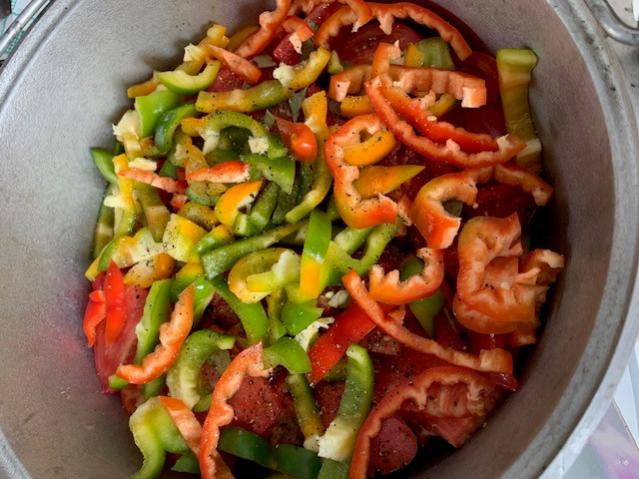 Хашлама! Решил я приготовить Хашламу (честно все руки не доходили). Как раз выдались выходные и мы с друзьями, с семьями у мангала собрались … Как оказалось рецептов Хашламы очень много, как плова или ухи например… Я выбрал простой, ленивый рецепт, просто слои уложил по своему и все…. Вообще готовить Хашламу очень просто, проще любого супа…))) Рецепт: мяса молодого кабаненка на кости (уголки, пистолетики) – 2.5 кг. Укладываем в казан, на дно, солим перчим + лавровый лист, сверху на него лук полукольцами, один стручок острого перца, помидор дольками так же слой, перец сладкий, морковь, сверху картошечку – каждый слой солим и перчим, без «особенных» специй. Сверху зелень: петрушка, укроп, кинза… Залил литром воды и 300 грамм пива (знаю, что в идеале вообще на пиве готовить, но решил как решил…). Закрываем крышкой, доводим до кипения и убавляем жар/огонь. 2 часа томилось это чудо в казанке и после открывания крышки стало одним из моих любимых блюд! Бульон – не передать словами, вкус овощей не описать, мясо – нежное, от косточки отходит, короче не могу рассказать…))), это надо пробовать! Рекомендую всем приготовить! Приятного аппетита!