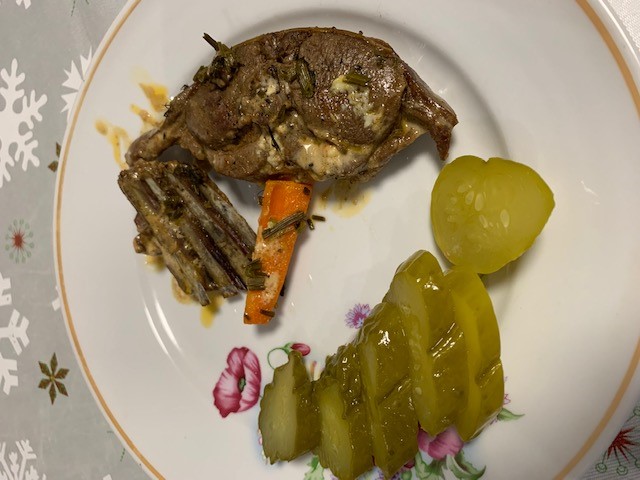 Ну и рецепт (очень часто спрашивали и просили рецепт именно зайца) Готовил зайца много раз, но покажу свой любимый рецепт: 1. Зайца после разделки необходимо вымочить в холодной воде, периодически ее меняя в течении 2-8 часов, я держал в этот раз 6 часов. 2. Далее мясо обсушиваем полотенцем и ставим казан на плиту. 3. Обжариваем мясо зайца на сливочном масле до румяной корочки, солим, перчим (можно добавить любимые специи). 4. Далее «изюминка» блюда, как я считаю – соус в котором будем тушить зайчика: Сметана + Майонез (50/50) + чеснок. В этот раз добавил розмарин и морковку (для эксперимента). 5. В смешанную массу выкладываем кусочки обжаренного зайца, добавляем чуть стеблей укропа и петрушки. 6. Тушить 1,5 часа при 180 градусах в духовке, лучше покрыть фольгой. 7. Приятного аппетита! Если есть или были неприятные воспоминания по вкусовым качествам мяса зайца, после приготовления по моему рецепту, они забудутся раз и на всегда. Мясо нежное, сочное и очень вкусное. Соус дополняет насыщенность вкуса мяса, а добавленный уже на тарелку соленый огурчик вообще превращает блюдо в шедевр! Рекомендую, друзья! Последний раз редактировалось Медведь25; 22.12.2020 в 11:26. |