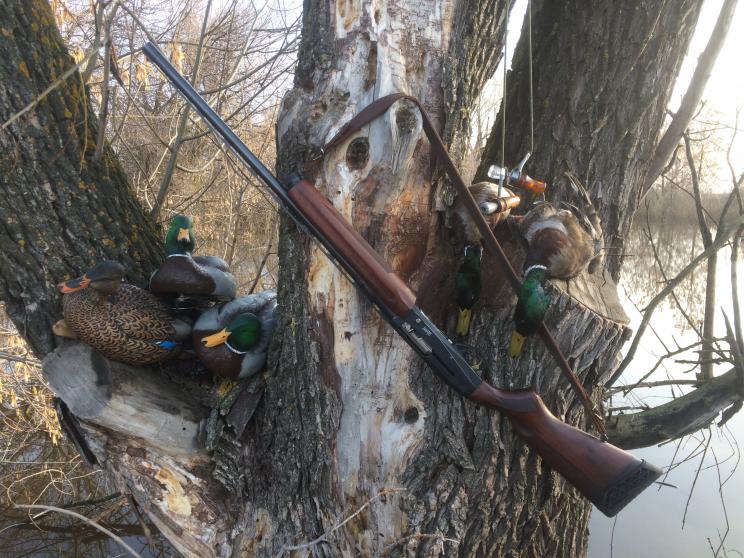 Все думаю хватит гусятничать надо на селезней переходить. Сказано сделано еду в субботу благо подсохло уже более менее и проехать можно куда то хоть вот смотрю лужы в полях около посадок решил там и встать кинул чучела утиные уточку и двух селезней в сторонке. Стою в маночек по крякиваю слышу отзывается и так мы с ним час наверно проболтали я уж и ждать перестал а тут смотрю вылетел и завис на чучелами видит селезней то и не садится тут влет не подвижную мишень и поразил.