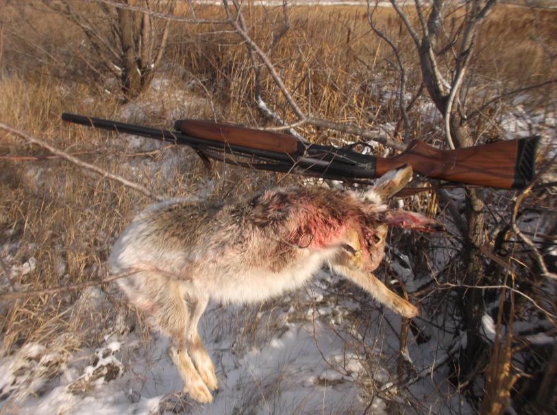 Наконец то открылся. Да к тому же очень к стати- завтра у бати Днюха 71 стукнет. Будет подарочный тушёный заяц. А началось всё так. В 8-00 я уже в полях. Ещё в сумерках нахожу след и давай по нему тропить. Обошёл жировки и нашёл выходной , но прямо в бурьян высотой 70-80 см. След то и дело теряется, но я его упрямо ищу.Пролазил я так метров 300. Как вдруг слышу -зашуршало впереди, но не видно не хе.а. И уже только метрах в 40 начала появляться над бурьяном и тут же пропадать ушастая голова. Отстрелял 4 патрона в надежде попасть в выскакивающую голову. Но увы. Прошёлся по гонному следу в поисках крови -но нет не попал.Сошёл с гонного и пошёл распутывать следующую жировку, благо их много. Кружился,кружился,ушёл в пашню,умотал он меня . Вижу ведёт он меня опять к жировке. Думаю -вот Змей. Закинул ружьё за спину и пошёл по заснеженной полевой дороге к машине. И вот он закон подлости когда ружьё за спиной. Оказалось что я не дошёл до лёжки каких то 20 метров. Заяц вылетел из придорожной травы как торпеда метрах в 10 от меня и понёсся прямо от меня по дороге. пока я скинул ружьё, пока с предохранителя ,пока выцелил -он уже метрах в 50. Первыми двумя мажу, а вот третим 00 пулумагнум(феттер)попадаю. Зая кувыркается через голову и начинает нагами ловить землю. И ему это удаётся , он вскакивает и давай дёру. стреляю зачем то ему в след последним патроном в стволе.Мимо. Бугу к месту попадания.кровь есть. А у меня всего один запасной патрон остался. Так как кровит сильно решаю передышки зайцу не давать. Так и вышло- зай пробежал метров 150 и залег в первой же высокой траве. Я за ним. Только сунулся в траву, как он выскочит в метре от меня и в пашню. И тут я совершаю свою любимую ошибку. Не даю ему отойти по дальше -луплю с 7-8 метров.Взрыв земли рядом с зайцем.Мимо. Но заметил что плечо у него всё в крови.Заяц пашню пересёк и опять в траву. А у меня патронов нема. Думаю может заяц там сам дойдёт. Выждал минут 15 и пошёл к месту куда зай сиганул. Достал нож для рукопашной на всякий случай. Заяц подпустил метров на 5 и опять через пашню в траву. Думаю -Нет так тебя не взять. Быстрее к машине и на всех парах домой за боекомплектом. Туда -сюда за 40 минут сгонял.Вернулся с 14 патронами. Ну думаю этого хватить должно. Оставляю машину метрах в 50 от последней скидки . Начинаю поиск , зайка уже успел свалить прилично. Да и ветер стал следочки передувать. Но заяц совершил ошибку- спустился в бетонный арык и по нему ушёл. К стати кровить уже парестал. Вылезя из арыка он скинулся в бурьян, где я его и нашёл.Поднялся он опять метрах в 3-5. В этот раз отпускаю метров на 15 и 0 магнум прилетает ему в затылок.Ура. Издаю крик Кинг Конга(оглядываюсь по сторонам не видит ли кто мою буйную радость) и довольный иду к машине. Больше всего рад что подранка не сгубил.