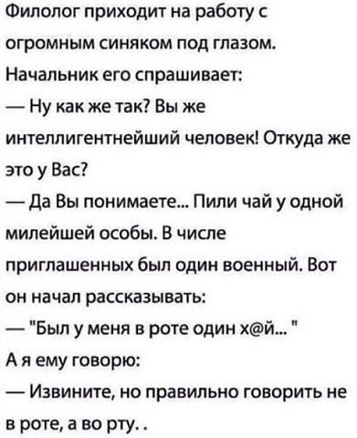 - что вам солдат? - пить хочется малый, ни будет чего? ответил солдат - да сейчас вынесу. Вынес малый глиняный горшок доверху наполненный квасом, бодрым, ядреным квасом. Солдат попил, еще попил и спрашивает: - много ли у вас такого кваса? - да, целая бочка стоит, вчера правда в ней крыса утонула (солдат обомлел ), мамка за ней лазила ей ровно по сиськи было. Солдат от растерености выронил глиняный горшок и он разбился. Малый заплакал. - что ты плачешь малый? - да во что я теперь какать то буду?!! |