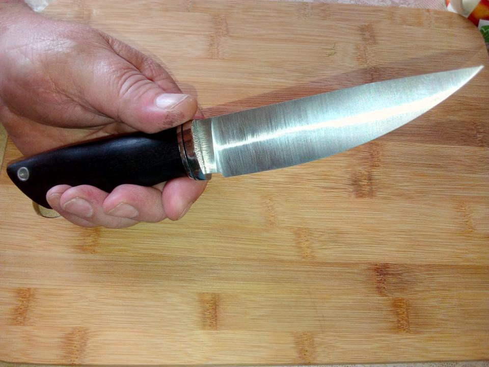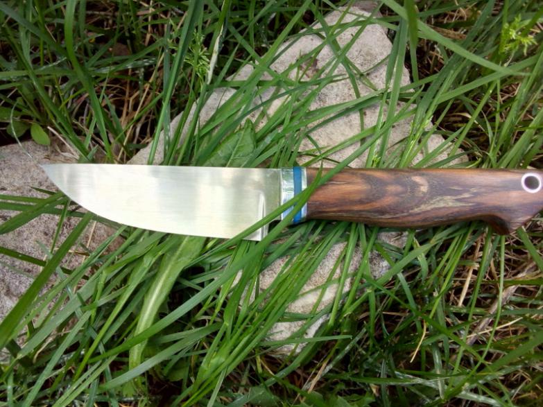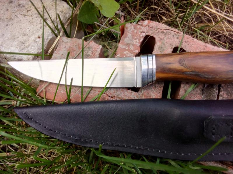 Сталь кованная не ржавеет, долго держит заточку 95х18 ТО Михаила Батурина. Длинна клинка 130 мм, ширина 28 мм, толщина 4 мм. Больстер латунь битый камень. Рукоять натуральное дерево Ясень, пропитка датское масло . Монтаж всадной на эпоксидку. Бритвенная заточка. Покрытие клинка ручной сатин . Твердость по Роквеллу 59 ЕД.Ножны натуральная кожа , свободный подвес. Прямые спуски от обуха , сведение 0,2 мм. 3200 р.