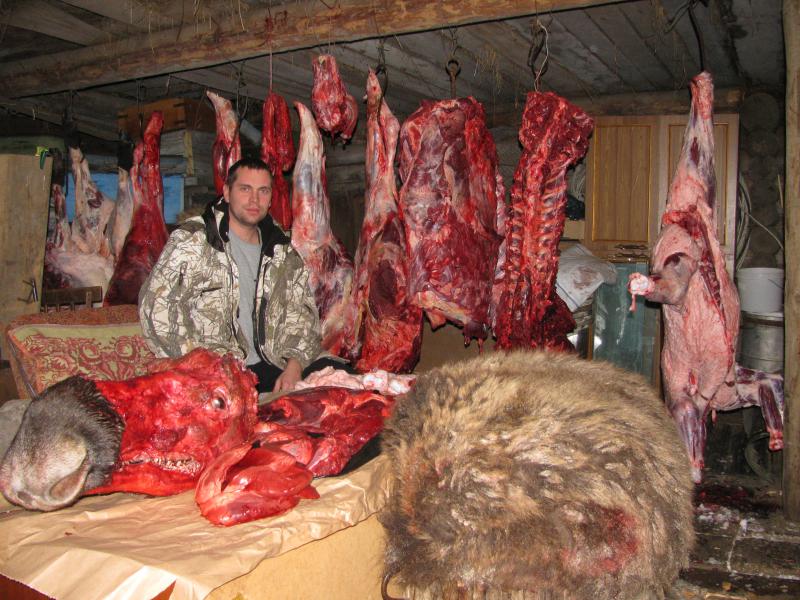 благополучно добыт и проверен,мясо хорошее. один бык 6-7 лет,2 подсвинка. на меня вышла лосиха с лосенком,дистанция была не меньше 100 метров с гладкого не попал ,за что от соратников получал всю дорогу люлей.