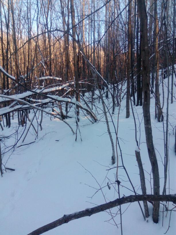 Поднялся метрах в 10 сзади меня из-под куста багульника, услышал его уже на махах, только снег взрывался из-под него. Вскинулся, но передумал, дистанция уже была метров за 40. Зай был размером с хорошую собаку. Попил чайку и пошел по следу. Эта скотина гонным ходом летела около 3-4 км!!! А потом я следок потерял, ветерок был и снежные заряды изредка. Обрезать не стал, т.к. уже около 12 км накрутил, ноги просились в машинку. Лыжи таскал за собой на привязи, а надо было на них. В общем, назначил я ему матч-реванш...