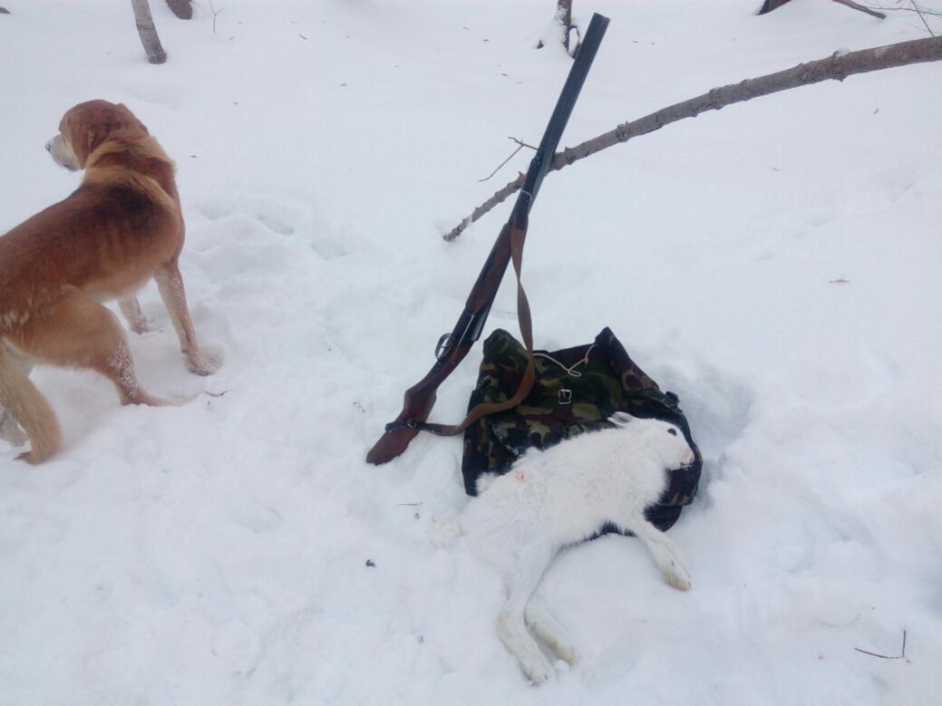 С вечера решил поеду .Прибыли в угодья раненько выжловку напустил .Гляжу заинтересовано челночит озимые,подошёл следок жировочный и належку.Метров через 300 собака помкнула и погнала.Но заяц в лес потом на трассу вобщем 1-0.Решил переехать возращаюсь к машине собака второго поднимает.2 часа гона и 2-0 в пользу зайца.Вымотались мы с выжловочкой решили домой (тоже не добрым словом себя .... за лыжи).Не доходя до машины сдвойка и прыжок .Ну думаю не уйдеш .Иду за собакой он её пропускает и прыжок в лево отпускаю на 20 метров чтобы собачку не задеть и 2 делает своё дело 2-1 размочили.