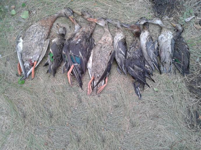 Вот и открылись. В принципе ни вот те на, но и не без дичи - улова... Мои - парочка крякашиков, а накануне - пара сазанчиков. Всё бы ничего, но и не без ложки дёгтя. Чуть не вступили в перестрелку с умниками, которые проходя на моторе вдоль камыша, в упор, десятками уничтожали "хлопунцов" (чёт в этом году на крыло поздно встают)... Блин, мы этих самых "хлопунцов", накануне - во время рыбалки, почти с рук кормили. Стайки насчитывали до 32 голов. Пипец - я такого не видел. Так вот нашлись отморозки, которые валили этот молодняк - десятками. К тому же шмаляли в сторону берега, товарищу пробили палатку, ладно хоть камыш несколько закрыл. Вот и пришлось "обороняться". Правда те, сходу на глиссер и в ерик... А в целом, нормально для открытия. Фото не очень - раритетный телефон...