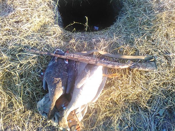 Вырвался на охоту в Татарию, в надежде застать последнего гусика, несколько дней назад его было в достаточном колличестве!!!!! И кстати он ушёл к вам в область!!!! Ну добрался как обычно ночью, сразу доехал до поля на машине. Ну и как обычно: окоп, чучела и маскировка! Потом отогнал машину в ближайшую посадку, поздний ужин и пока есть два с небольшим часика свободного времени решил кимарнуть! Да! Кстати пока копал окоп слышал как в небе с севера на юг пролетали лебеди, за два часа 5 стай леблядей и один косяк гусей! Ну вот! Время собираться в окоп, утро было морозное, ясное и безветренное, что очень меня настораживало! И вот я уже в окопе вслушиваюсь в тишину морозного утра!!! Уже светло и вороны улетели кормится, дрозды летают туда сюда а гуся все нет и нет!!!! Курю, пью кофе, наслпждаюсь хорошим утречком! Вдруг, мой слух столь долгожданный звук ГА-ГАК!!!!! Начинаю манить,мне отвечают, моя дудочка меня не подводит! Вижу на противоположной стороне поля два гуменника заворачивают в мою сторону!!!! Ну всё! Думаю мои клиенты! Они мне голосят, я им тоже люлюкаю! Первый круг- высоко прошли! Осторожные!!!!! Второй круг стороной прошли!!!!!! Третий круг: высота 30 метров, до меня метров сто, ломают крылья снижаются, идут прямо в лоб, снижаются до пяти метров, выпускают шасси Иииии !!!!!!! Вскакиваю!!!!!! Здрасте ребята! Первый выстрел, гусь падает подранком, второй гусяра на разворот и уходить задумал, но второй выстрел- зацепил, третий выстрел и здоровенный гусяра падает комом! Боковым зрением вижу как первый гусь уже несётся по полю помогая один целым крылом, но опять же, дробь номер2 в ФЕТТЕРОВСКОМ патроне остановила его навсегда! На этом утрянка закончилась! Потом поиски гуся по полям и на воде положительных результатов не дали!!!!! Пообедав решил выдвигается домой! Теперь приеду только весной!