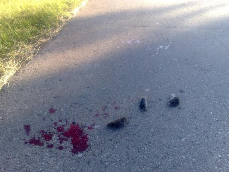 Вчера во время вечернего объезда "щелкнул" лисичку со 112 метров. Вышла прямо на дорогу, но из-за встречной машины соскочила в кусты за обочину. я проехал и остановился, взял карабин и вылез через пассажирскую дверь. Вскинул: смотрю выходит, несет что-то в зубах. Выстрел за лопатку и она метнулась через дорогу прыжками (было видно что попал). При прыжке в овраг за обочину она перевернулась и убежала через посадку. Думал рана несерьезная, но когда подошел обнаружил приличную лужу крови на месте и брызги ее на 1,5-2 метра. Рядом лежали 3 мыша. Целил за лопатку, судя по крови попал в грудную клетку.