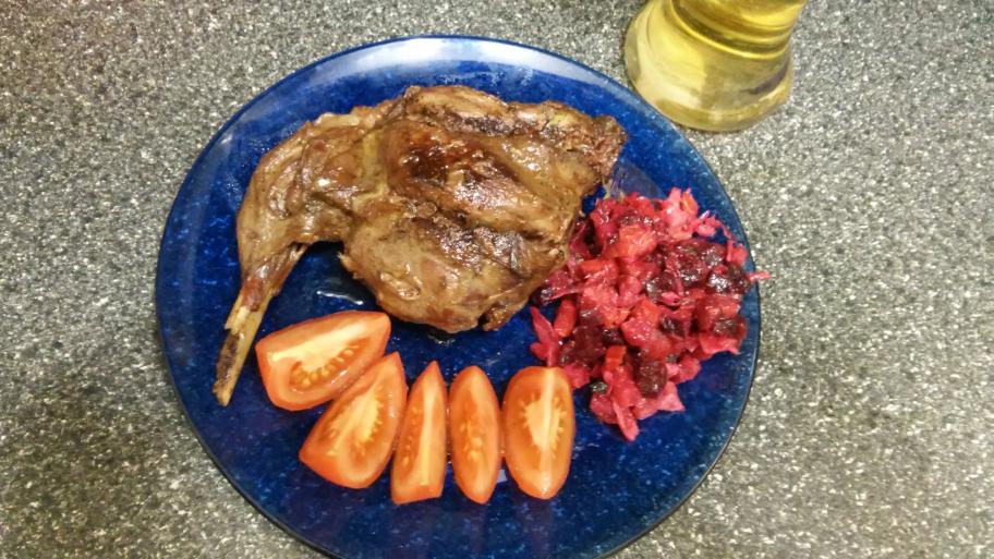 Вчера испортили настроение на работе. Пару кусков косулятины (задок) замороженные на ночь в воду. Утром обработал. Мясо обвалял в смеси: прованские травы+ложка горчицы+ложка майонез на перепелиных яйцах. На день в холодильник. Вечером в разогретую духовку на 1.5 ч. Итог на столе. Домашние "разминаются" сухим красным 2012 г под мясо, я аблизываюсь.... Утром на охоту.