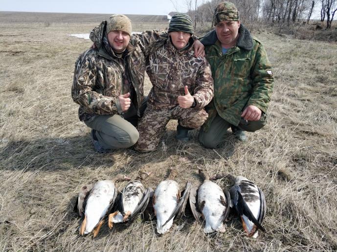Доброго вечера, решил закрыть гуся в Саратовской обл. Вот лечу туда и думаю наверно зря!? Итак прибыл на место, заморачиватся не стал и в старый окопчик(кем то уже выкопанный на прошлой недели).Поставил чучела жду................. тут в часиков 19:00 как пошла стрельба по всей Саратовской губернии не иначе война, а у меня тишина и тут я было совсем расстроился, как вдруг мои чучела облюбовала стайка (5-6 шт)"морячков" и без подготовки к ним на посадку нуууууууу "МУРОЧКА" не подведи, первый выстрел и один камнем прям рядом с окопчиком, падает второй мимо, третий, стая уже далеко......................тут смотрю один начал снижаться и метров за 800 от меня садится подрываюсь бегу, метров 500 пробежал дыхалка сбилась (вот оно кабинетное времяпрепровождение),мой гусик расправил крылья и пытается взлететь думаю все трофей уйдет. Остановился и с грустью провожаю взглядом, как вдруг камнем падает и замирает. Потом когда ощипывал две дробины обе в шею. Итого два морячка со мной домой!!!