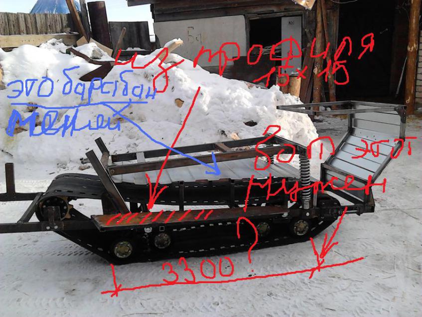 Мой каркас сейчас весит около 45-50кг. Я думаю норм будет. С углом передним тоже думал уменьшать, пока так оставлю, в принципе можно просто крутануть крепеный мех-м на 180град. Но тогда угол наверное будет совсем маленький , а может и нет())надо посмотреть.Сегодня вытаскивал на снег. рыхлый. мне по колено, установка проваливается см на 8. |