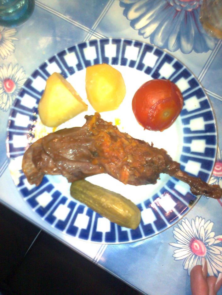 А вот и ножка рождественского зайчика, тушёная с луком и морковкой. С самым вкусным гарниром: маринованный огурчик, помидорчик и отварной картофель. СМАК!!!