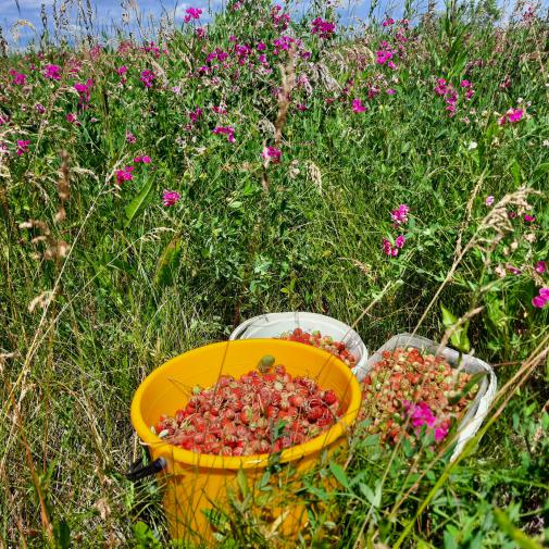 Земляники в этом году просто невероятно много. Везде . В прошлом году, осенью, ставил капканы ,увидел земляничник, место приметил . Три дня назад нарвал по дороге на пляж с ведро, а больше мне и не нужно, так как урожай домашней клубники тоже удался..да и вообще ягоды море...сначала жимолость, клубника, сейчас малина... вишни очень много...абрикосы набирают вес...боюсь морозилок не хватит