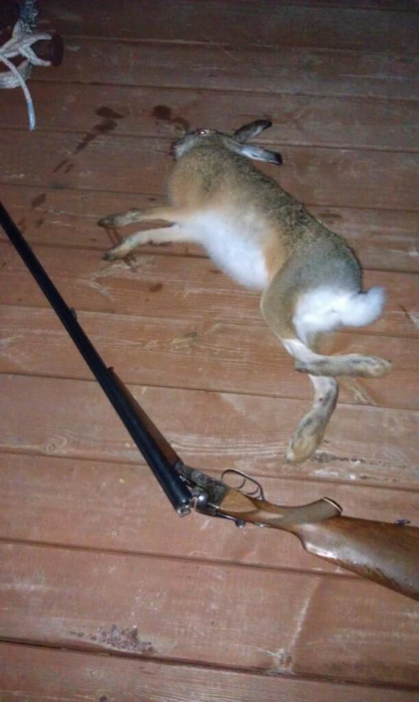 ...остров на середине Волги...погода пасмурная, без дождя, зайчик поднялся в десяти шагах из травы...бил товарищ, тройкой...